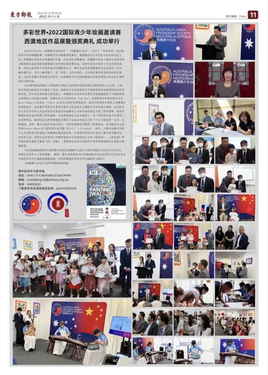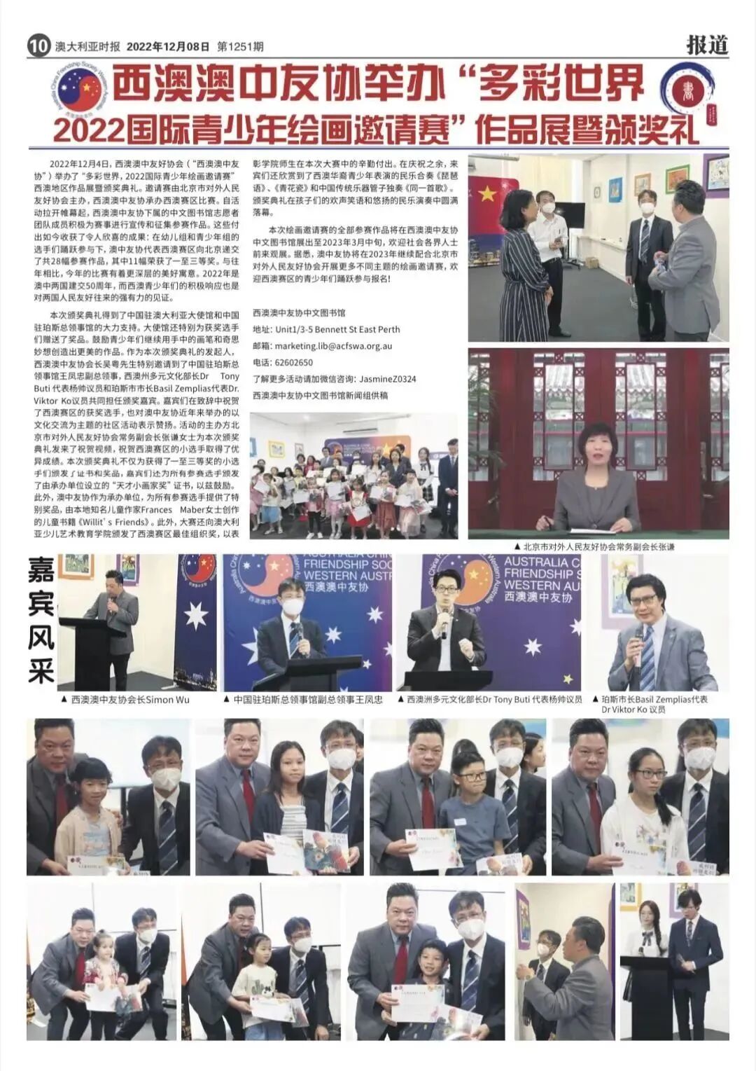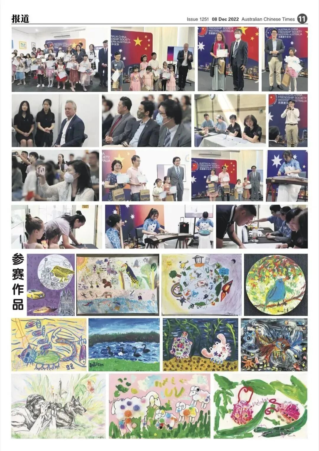 自今年5月,“多彩世界”绘画邀请展面向全球青少年发起作品征集,西澳澳中友协中文图书馆广泛宣传、精心组织,取得了优异成果,向主办方提交了28幅参展作品,11幅荣获奖项。2022年是澳中两国建交50周年,西澳青少年们用画笔描绘多彩世界,成为两国人民友好往来的有力见证。