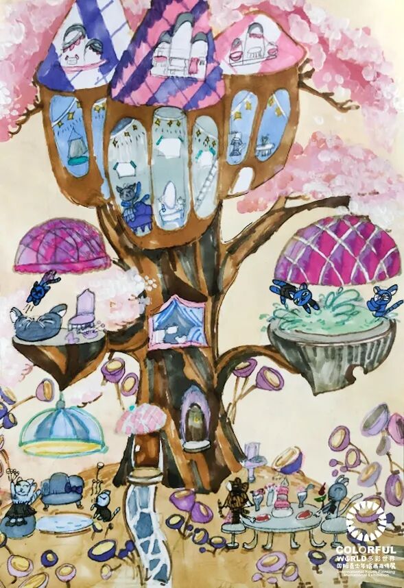 这个作品,小朋友很有创意,他通过一棵树,在这棵树上边儿想象出了一些游乐园似的一个世界,而且色彩比较和谐,不是那种非常强烈对比的那种。因此,这张画从哪个方面来看都表达了“和谐”二字,正是人与自然的一种和谐的体现。