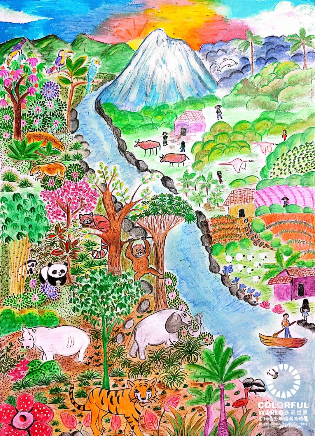 This work is one of the outstanding art pieces in our selection. The painter is a bit elder in age. The painter’s mature sketching technique could be seen in the painting. It brings together several animals with elephants in the middle, and the heads of some large animals nearby. There are no specific details except the heads, but these five images show the diversity of large animals in the forest. It is visually powerful and expressed in the form of a sketch.